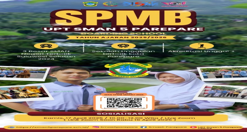 Untuk informasi lengkap mengenai jadwal, syarat, dan alur seleksi, akan disosialisasikan secara resmi pada hari Kamis, 17 April 2025 melalui pertemuan virtual Zoom. Sosialisasi ini akan dilakukan berdasarkan edaran resmi yang diterbitkan oleh Tim Branding UPT SMAN 5 Parepare.